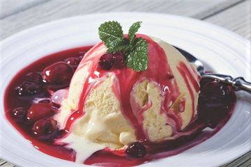 Pitted Amarena Fabri cherries in syrup. Carmelized and served over French Vanilla Ice Cream. Finished with a mint leaf